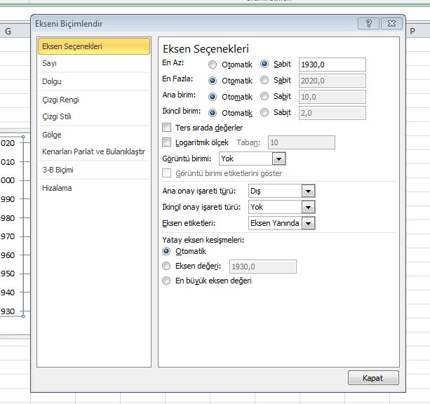 Bir kullanıcımızın Excel 2007’de hazırladığı iki veriden oluşan yatay-çizgi grafiği Excel 2010’da sıkıştırılmış bir şekilde görünüyordu. Biraz araştırmadan sonra fark ettim ki Excel 2010’da Ekseni Biçimlendir seçeneklerinde (ilk sırada) seriyi sınırlayan bir seçenek var. Bu seçeneği otomatik duruma getirdiğimde grafik doğru görüntülenmeye başladı.