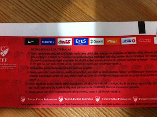Biletimizi maç günü aldığımız için kale arkaları, doğu ve batı tribünlerinin kenar kısımlarında bilet kaldığını öğrendik. Cevahir Biletix gişesindeki görevliler tüm biletlerin satıldığını ve sadece az önce saydığım kısımlarda bilet kalığını söylemişti. Batı kenar 103 diye tabir edilen kısımdan on beşer lira ödeme yaparak biletimizi aldık. Stadın tamamen dolu olacağını düşündüğümüzden erken gidip, yanımıza evde yaptığımız sandiviçlerimizle stat içerisinde orucumuzu açarız diye düşündük. Elbette stada su şişeleri, kutu içecekler alınmayacağını biliyorduk. Ayrıca biletlerimizin arkasındaki “Müsabakayla ilgili yasaklar” kısımdaki maddeleri de dikkatle okuduktan sonra sandviçlerin bir sorun olmayacağını düşünüyorduk. Şimdi size bu maddeleri hatırlatmak istiyorum.