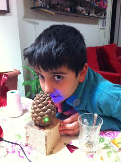 İlk olarak kozalağı altından yukarı doğru kalın uçlu bir matkapla deliyoruz. Sonrada daha ince bir uçlu matkapla led’leri koyacağımız yerleri deliyoruz. Deldiğimiz noktalardan renkli ledlerimizin kablolarını geçirip aşağıdaki delikten çıkartıyoruz. Ledlerimizin kablolarını pilimize bağlayıp yakıyoruz.