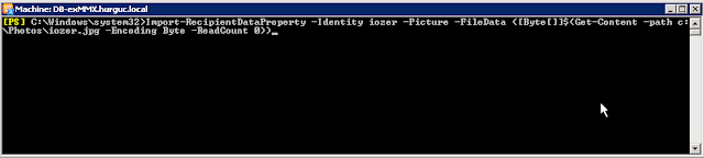 Import-RecipientDataProperty -Identity iozer -Picture -FileData ([Byte[]]$(Get-Content -path c:Photosiozer.jpg -Encoding Byte -ReadCount 0))