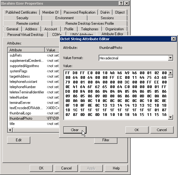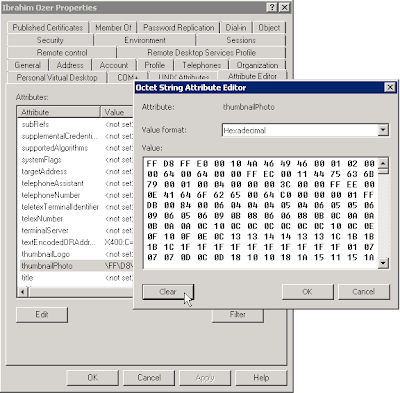 Active Directory’den kullanıcının hesabını bulupi çift tıklayarak açın. Attribute Editor sekmesine geçin. Burada thumbnailPhoto’yu bulup açın. Clear düğmesine basın. OK düğümelerine basarak pencereleri kapatın. Böylece kullanıcın fotoğrafı silmiş oldu.