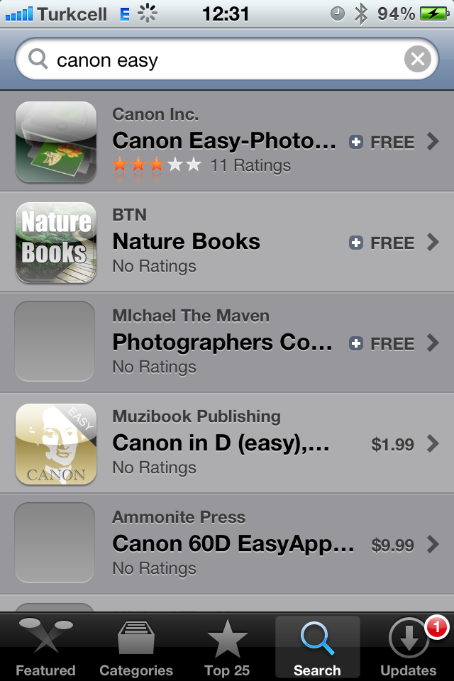 1. iPhone’dan App Store’a girip, Search bölümüne geçiyoruz. “Canon Easy” yazıp arama yapıyoruz.