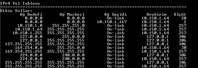 Aşağıdaki resimde de görebileceğiniz gibi en üst satırdaki kayıtta ağ geçidi olarak On-link görünüyordu.