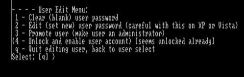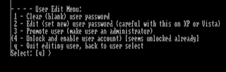 6. Şimdi hangi kullanıcı için parola resetleyeceğimizi belirlemek için gelen menüden tekrar 1‘e basıp Enter‘a basıyoruz.