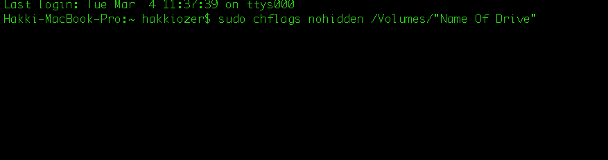 chflags nohidden /Volumes/DiskinAdı
