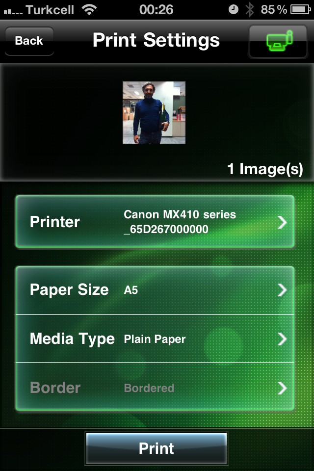 6. If the Printer section says None, click here to search for our printer. After finding our printer, click the Print button, and our printer will start printing the photo we sent.