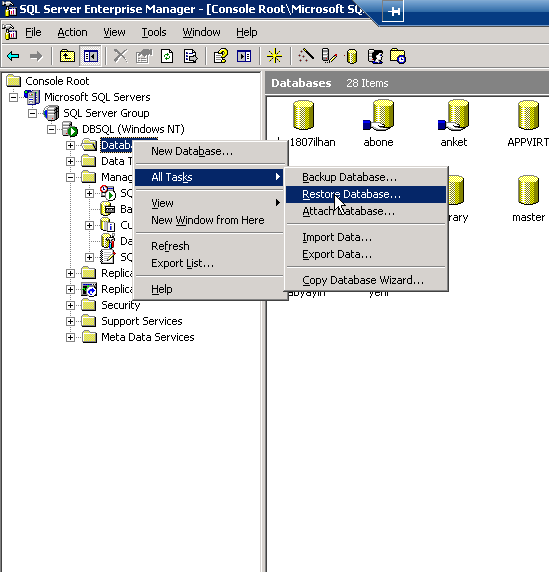 It’s very easy to restore a database in Microsoft SQL Server 2000 from a backup.