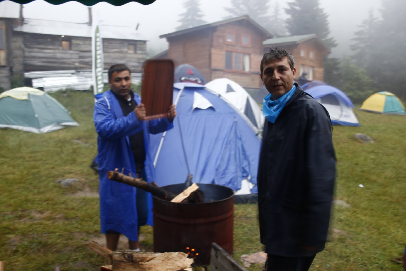 Fabrikaya girişte sol tarafta da görüldüğü gibi üstümüzü başımızı örttüler 🙂 A’dan Z’ye tüm aşamalarıyla çay üretiminin safhalarını gördük. Ayder Yaylası’ndaki kamp alanımıza geldiğimizde sağanak şeklinde yağan yağmur bizi karşıladı. Yağmur altında Colombia’nın kurulumu büyük bir bilmece olan çadırını kurduk.Kurduk kurmasına ama yağmuru da her yerimizde hissettik.