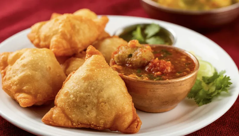 - Samosa: Dışı çıtır, üçgen şeklinde hamurdan yapılan, içi baharatlı patates, bezelye ve soğan dolgusuyla doldurulmuş, derin yağda kızartılan bir börektir. Genellikle tatlı (tamarind) ve acı (nane) soslarla yenir. Doyuruculuğu sayesinde hızlı bir atıştırmalık olarak popülerdir.