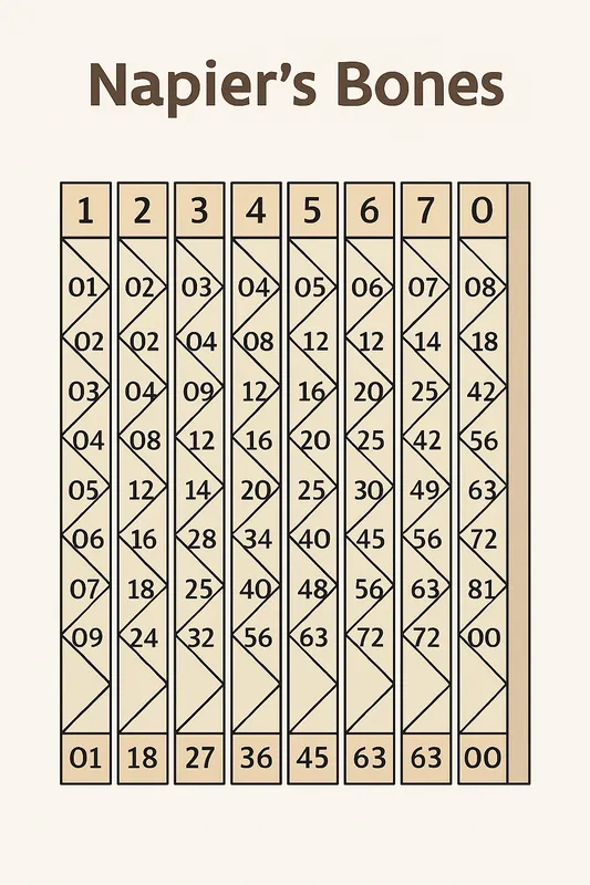 - Napier’in Kemikleri (Napier’s Bones): Çarpma ve bölme işlemlerini kolaylaştıran hesaplama çubukları geliştirdi. Bu cihaz, daha sonra hesap makinelerinin gelişimine ilham verdi.