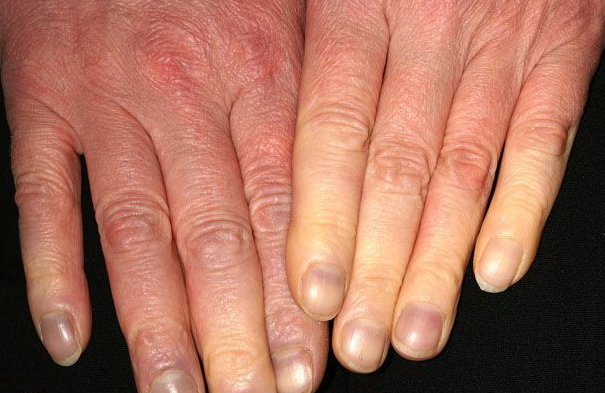 | Raynaud Sendromu görülen bir hastanın elleri |